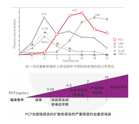 对感染早期预警及重症肺炎、脓毒血症等诊断灵敏度和特异性更高。IL-6在炎症出现后1h内即开始升高,并诱导PCT和其他急相蛋白逐渐升高。联合检测,IL-6可填补PCT未升高前的空窗期,从而对感染进行更早预警。